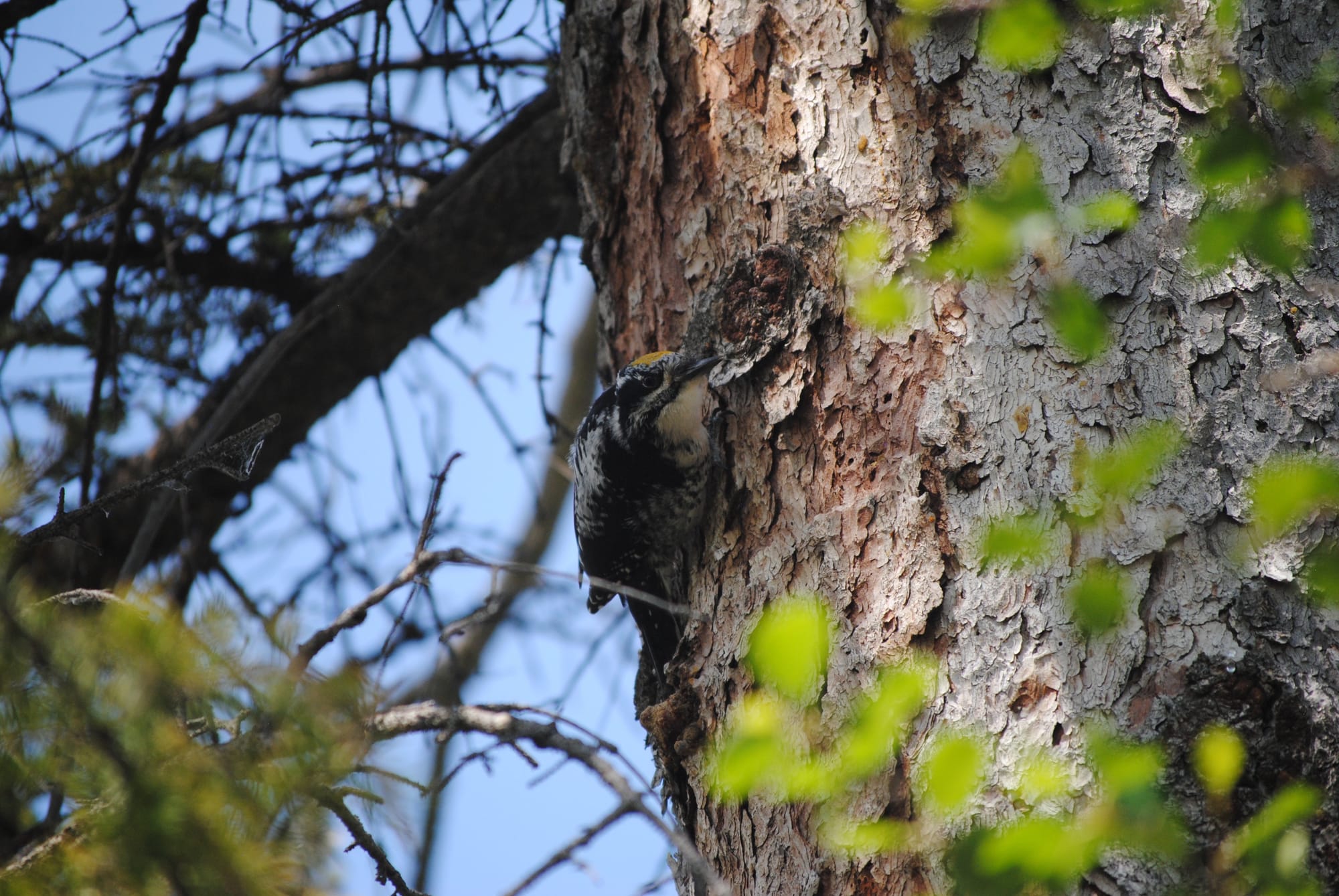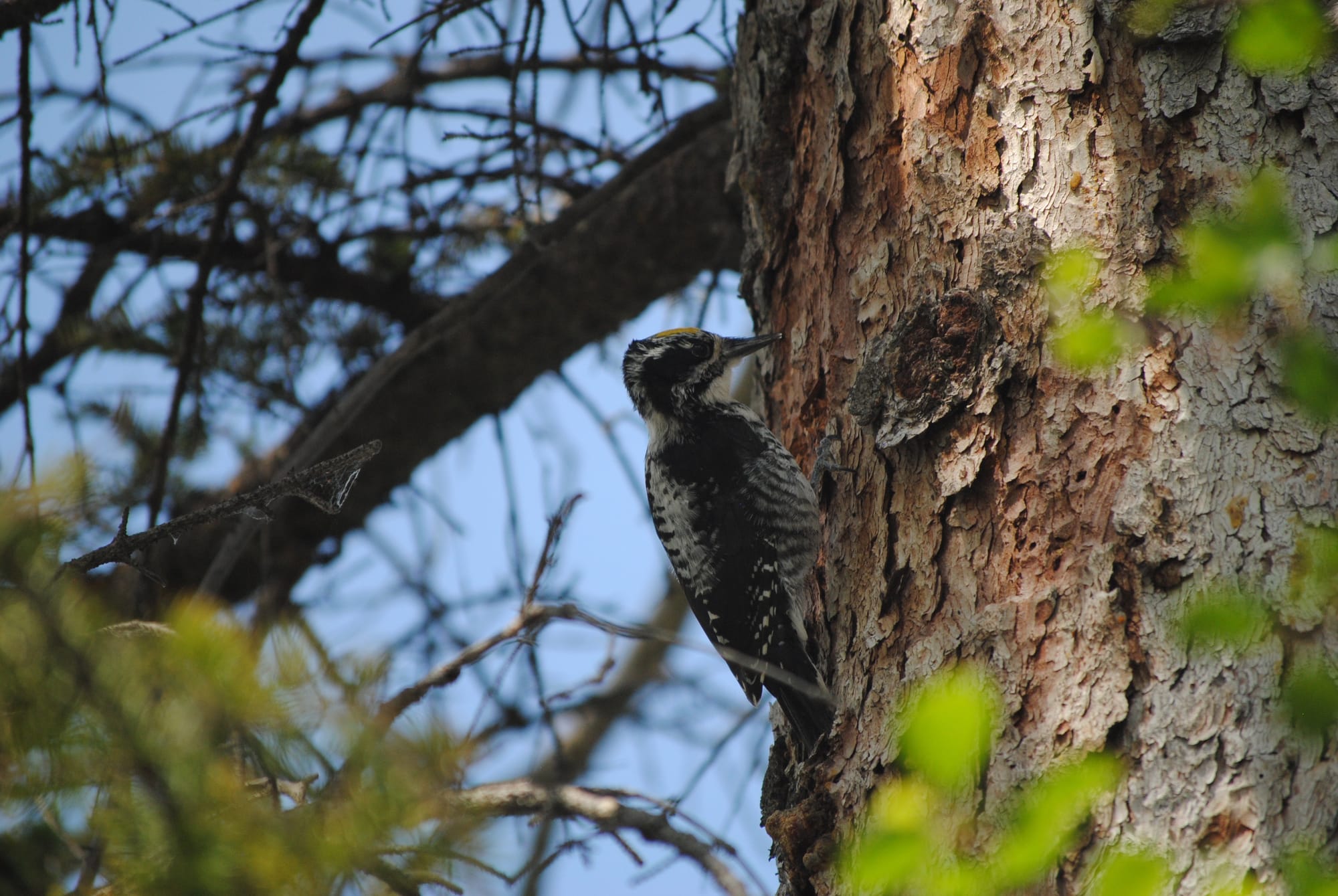 Firstly, while we were trekking along the Elbow River, we heard the drumming of this American Three-toed Woodpecker (Picoides dorsalis) above.
